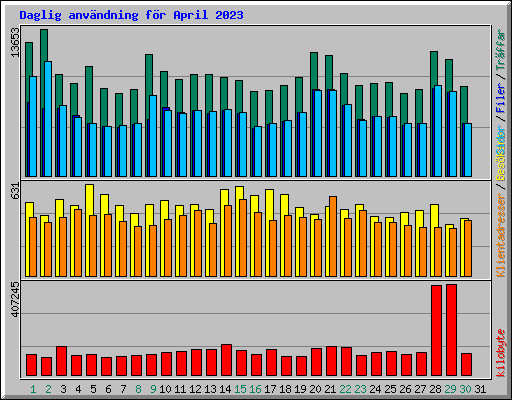 | Dag | Träffar | Filer | Sidor | Besökare | Klientadresser | kilobyte | ||||||